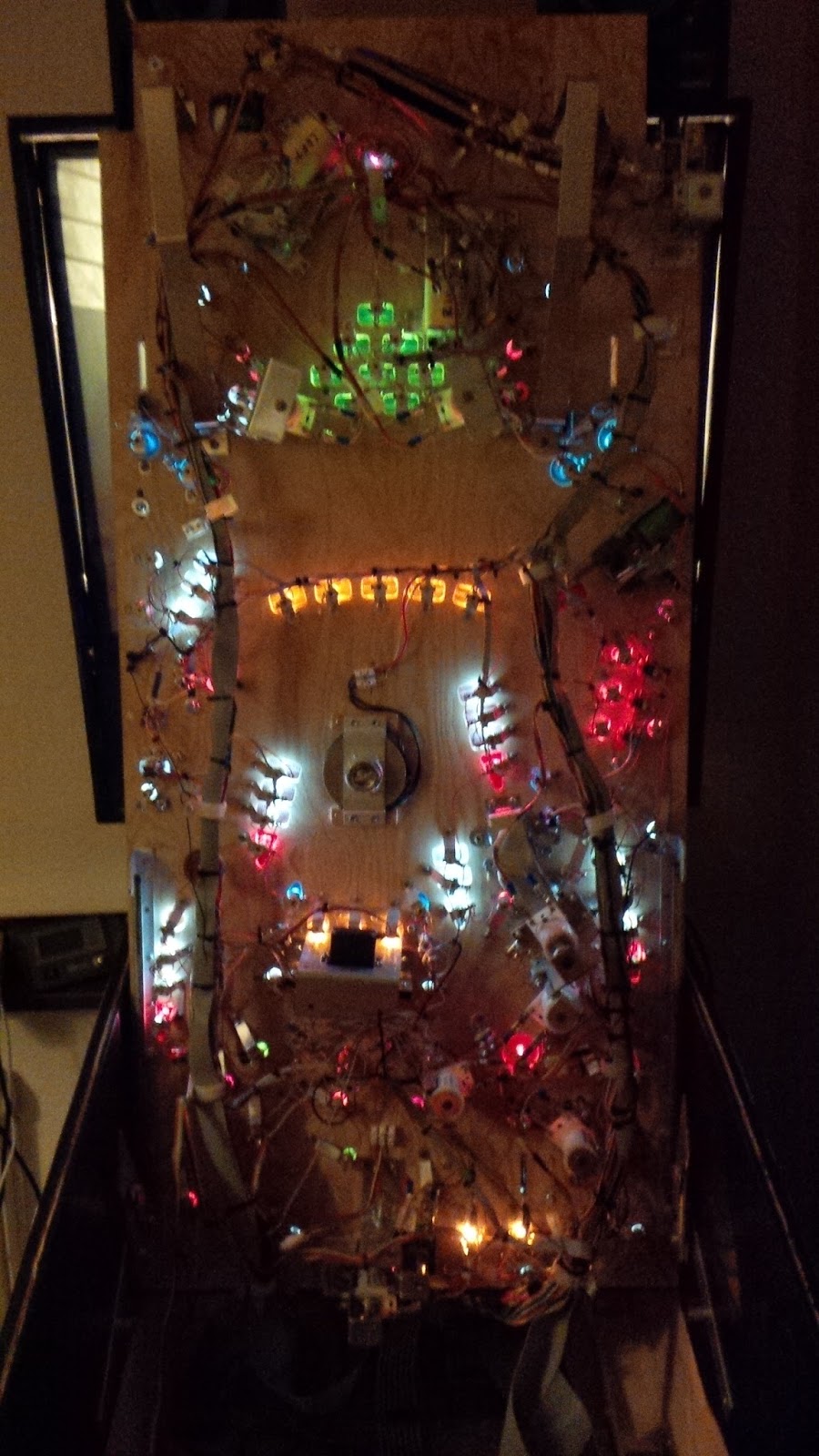 2 flippers, 3 bumpers, 2 VUK, 1 Saucer, 1 motorized targetbank, 1 animated Big Daddy figure, real DMD display. Goal of game is to rescue or harvest little sisters, gain plasmids, face off with splicers and defeat Big Daddies. Based on custom circuitry, ChipKit Max32 and Wav Trigger.